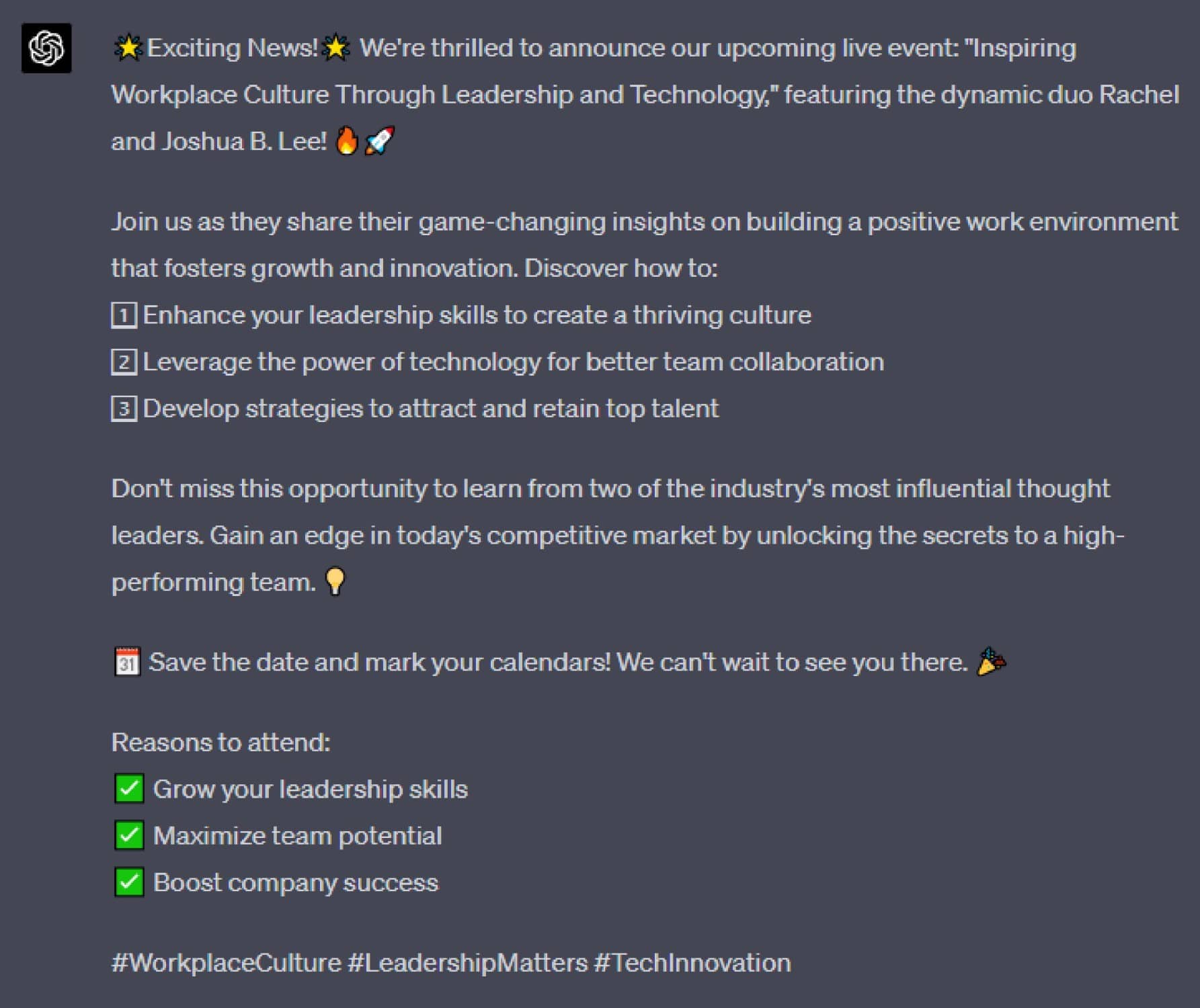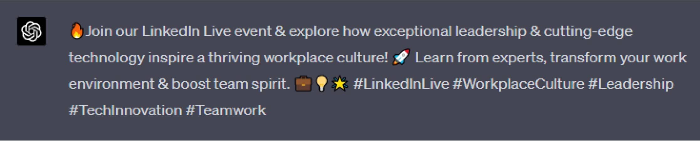 “ChatGPT, I need a 280-character tweet to promote my LinkedIn Live event on [inspiring workplace culture through leadership and technology.] Please include relevant keywords and hashtags.”